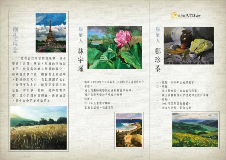 玉里鎮公所表示,兩位聯展畫家平時皆有正職工作,憑藉著對繪畫的天分與熱情,利用閒暇時光以油彩將花蓮及世界各地的美景一一呈現在畫作中,讓人體驗到自然環境的美。透過這次的展覽讓鄉親們看見花蓮自然的風光,將對花蓮的深厚情感利用繪畫表現出來,期盼觀賞者感受到畫作所傳達出來的意義,並喚醒人們愛護環境、熱愛自然,並維護這塊美麗淨土的心,讓生活更加亮麗。