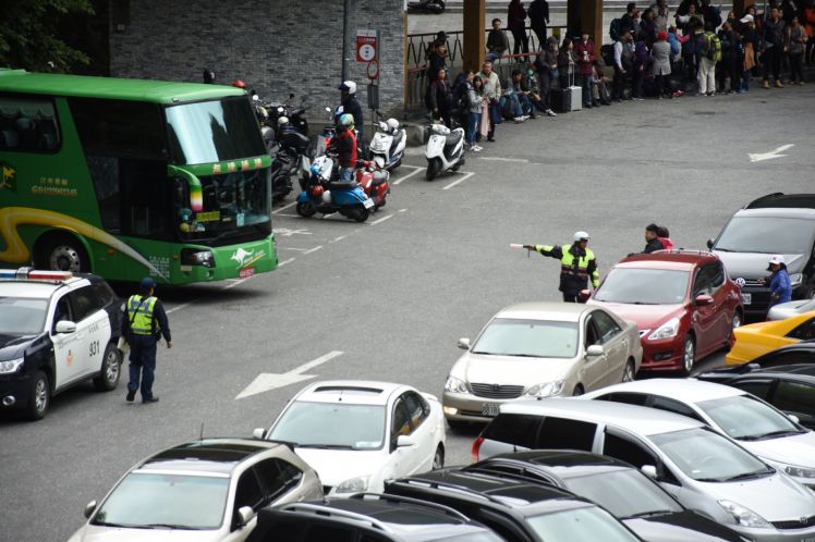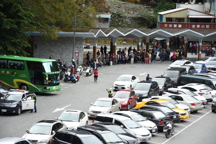 中午時段,大批遊客擠向天祥商圈用餐,瞬間將天祥停車場擠爆,天祥派出所及保七九大隊員警,頻頻在停車場內疏導指揮,勸誡小型車勿占用大型車停車位,以免公車及遊覽車無處可停,而引導小型車停往天祥遊局旁及文天祥公園附近,維持交通動線之順暢。