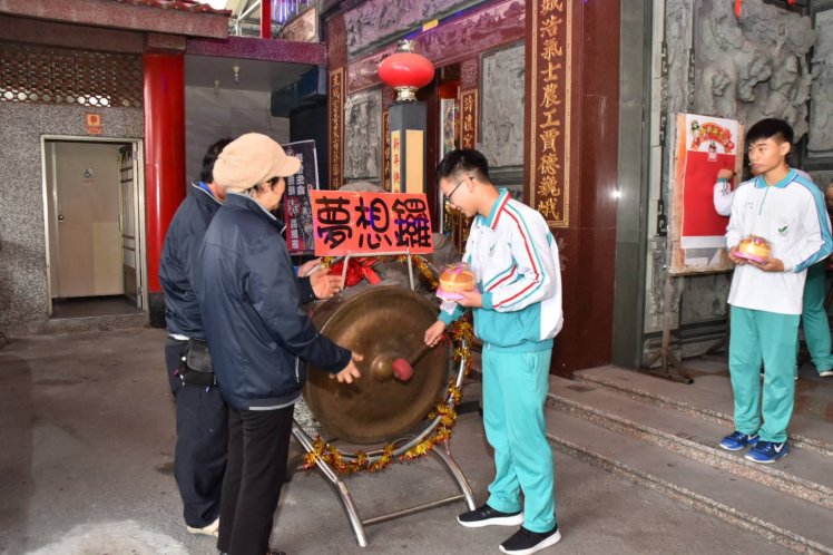 學校也特別精心準備了代表聰明的葱、代表勤勞的芹菜、代表好采頭的蘿蔔,以及象徵包高中的包子、粽子,希望他們能夠勤奮努力,聰明智慧,金榜題名,最後由校長贈送每位考生狀元糕、家長會長贈送功名糖,吳董事長也特別準備今年剛設計完成的帝君聖像及文昌筆贈送給考生,祝福考生能夠定心、靜心、安心、信心的面對未來的挑戰,在應考時思慮明朗,觸類旁通,思緒如潮湧,運筆如行雲,能得心應手,展現實力,受帝君加被保佑,身心靈健康自在。這些滿心關懷都是家長、師長們滿滿的愛心與祝福。參加的高三同學張亦承表示,第一次參加這樣的活動,覺得非常有意義,除享受「包高中」祝福禮盒外,也深深感受溫馨、莊嚴的儀式中,心靈感到無比的詳靜平和,自己更覺有信心,也感謝校長、協天宮董監事及家長會長與許多老師的祝福,給予我們無限勇氣與信心面對大學學測及未來的人生,真的非常有意義;最後由同學親自敲下許願圓夢之鑼,在響鑼聲中集氣立定目標,相信同學將會表現精采,締造另一波玉里學子的傳奇。
