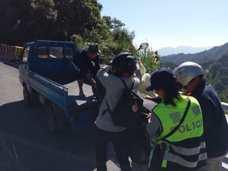 潘員查看確認機車後輪是被尖銳物品插入才導致爆胎原因後,馬上幫忙聯絡富里鄉內機車行,但是無奈適逢星期日大部分未營業,少數有營業的車行也因為地處偏遠且道路蜿蜒崎嶇(來回一趟30公里)不願前往救援,潘、鍾兩員在束手無策之下,便打電話請求所長鍾日順設法解決。鍾所長了解後狀況後,馬上聯絡轄內有小貨車的村民,在熱心的林姓村民義務幫忙之下,才化解這場「破輪危機」,順利把機車運到山下機車行維修,吳民一家人也放下心中的大石頭,也漸漸露出了笑容。吳民表示,本來想趁假日與老婆,小孩騎機車兜風順便要去東河吃有名的東河肉包,但是半路上兒子的機車後輪卻突然爆胎,剛好卡在花蓮縣富里鄉與台東縣東河鄉的深山交界處,搞的一家人措手不及進退兩難,本想找路過貨車幫忙,但是苦等了半小時,只有幾台腳踏車和機車路過,最後沒辦法只好請求警方協助,好在有警方及村民熱心的幫忙,才能從深山中脫困。吳民為此當下向協助林姓村民表示可補貼油錢及工資,但林民拒絕表示,父親是巡守隊員,派出所鍾所長打電話請託幫忙,我們村民是情義相挺,也是做善事,不需要任何回饋。