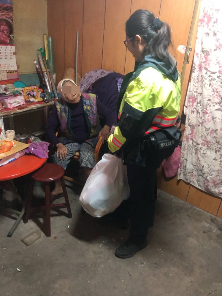 警員康馨勻特別轉介善心人士的物資,趕在過年前送交到老阿嬤家裡,補足一些生活上所需要的民生用品,讓老阿嬤好過
