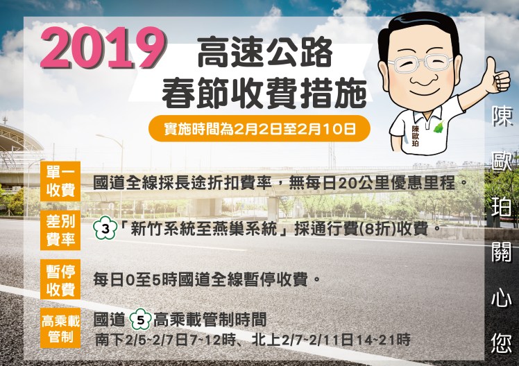 高公局交通管理組張崇智組長表示,南下交通量尖峰預計集中於初一至初三;北上則集中於初三至初五;雙向交通量最大為初三,可能湧現7倍車潮。今年高乘載管制時段為初一至初三(2/5-2/7)7-12時,管制國五南下南港系統、石碇、坪林。初三至初六(2/7-2/10)14-21時管制國五北上蘇澳、羅東、宜蘭、頭城交流道。費率部分,比照歷次連假採取單一費率,深夜0-5時,國道全線暫停收費。