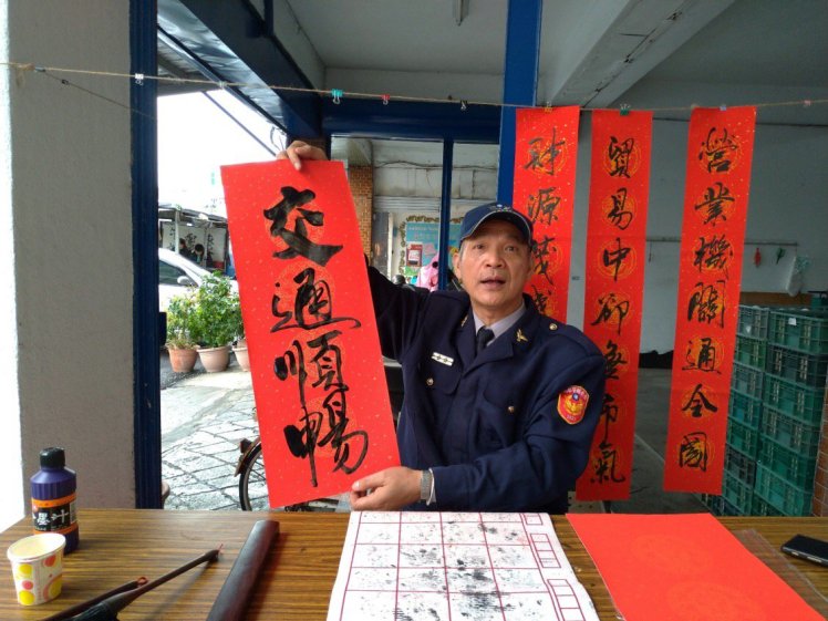 「熱心揮毫做公益!」成功警察分局舉辦「108年加強重要節日安全維護工作」治安、交通安全宣導暨愛心春聯義賣活動。勤指中心主任鄭世華為警界書法高手,運筆玄妙入神、揮翰成風,引起成功鎮民熱烈迴響,吸引許多鄉親前來樂捐做公益,義賣所得則由分局長方秋梅偕同志工中隊,全數捐贈給聖心老人日照中心,讓年邁的長輩們一同平安過好年。
