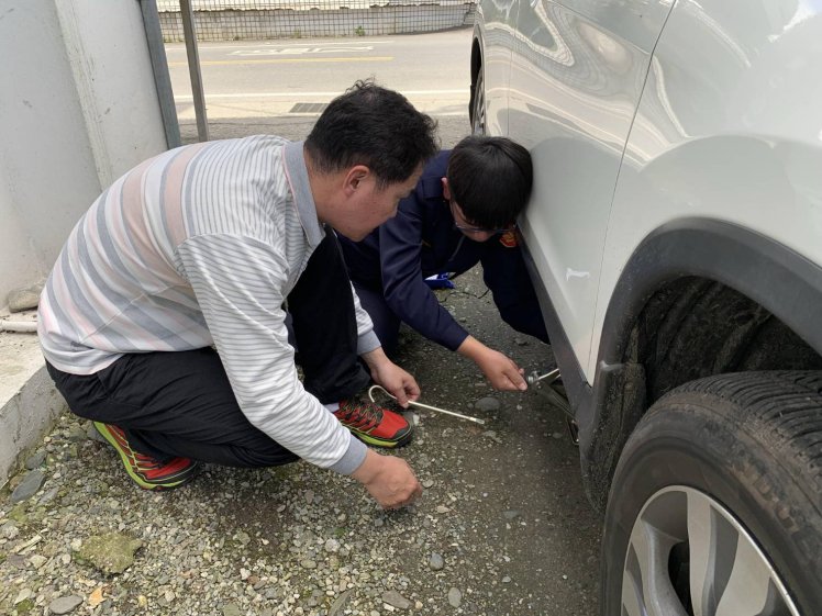警員羅郁瑄值班時發現一輛休旅車緩緩駛進派出所前空地,駕駛下車一直在檢視車輛的右前輪胎,經上前關心詢問,陳姓車主焦急地表示,行駛時感覺輪胎似乎有胎壓異常現象,輪胎好像越來越消氣,很擔心發生意外。