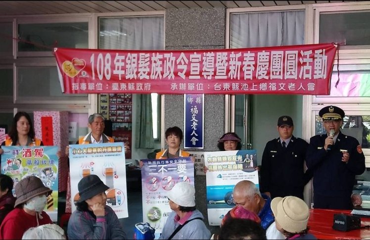 臺東縣警察局關山分局池上分駐所所長廖建全,於今(25)日10時許,運用轄內福文社區辦理「108年銀髮族政令宣導暨新春慶團圓活動」時機,率所內同仁及警察志工等人前往,並以「國臺語雙聲」與村內長者「博感情」,宣導交通安全及晨昏外出穿著應注意事項,再搭配有獎徵答,現場反應熱烈,宣導效果一級棒!