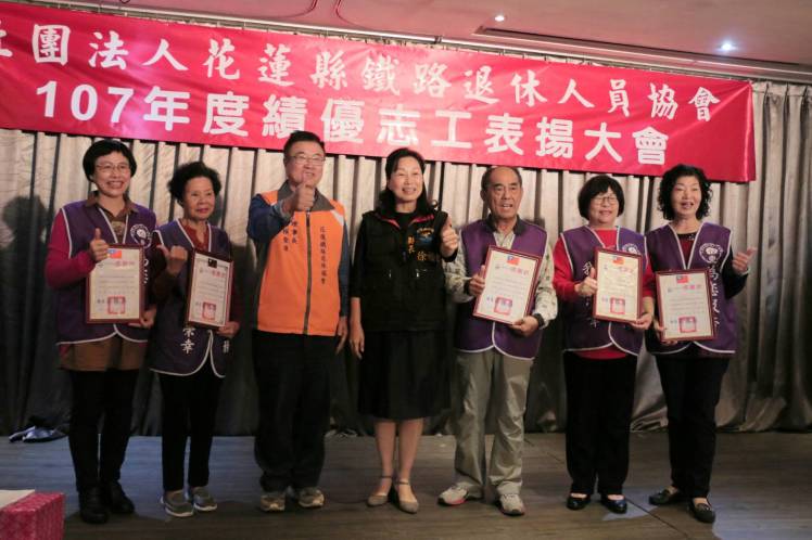花蓮縣鐵路退休人員協會今(5)日於永豐餐廳辦理優秀志工表揚大會、第7屆第2次會員大會,會中表揚72名鐵路志工,其中志工邱桂枝、楊暢生服務時數分別高達2173、2129小時,令人感佩。縣長徐榛蔚表揚並肯定志工發揮「退而不休」的精神,以笑容服務人群,投身社會公益不遺餘力,讓來訪的遊客感受到花蓮人的友善及團結。