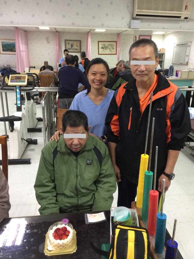 其中,院內日常工作訓練是住民們在復健復能的過程中,不可或缺的重要環節。有二位住民在職能治療師的轉介下,在玉里醫院萬寧院區的物理治療室中,擔任復健小幫手。盡心盡力維護著治療室的環境清潔、或協助帶著行動不便的居民如廁、又或是幫忙治療師維護復健病人的安全。在每日規律地作息中,住民們覺得這樣的工作讓他們覺得自己很重要,來治療室工作幫助別人很有成就感,也能讓自己的生活更健康。日前其中一位住民跟復健師說:老師!明天是我的生日,60歲的生日。哇!60大壽,治療師很高興也很願意幫他過生日,於是買了個精緻的草莓蛋糕感謝他的付出與努力。這位可愛又努力的住民能夠克服身心障礙,願意為自己邁出健康的一步,大夥都為他感到欣慰與驕傲。