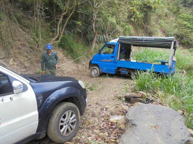據了解,王民於日前駕駛自小貨車欲前往其位在達仁鄉新化山區的段木香菇園工作時,因倒車不慎,導致小貨車後輪陷入產業道路鬆軟泥濘駁坎裡。該民受困於新化深山產業道路懸崖邊,車輛搖搖欲墜,進退兩難、求助無門,只好打電話向警方求援。
