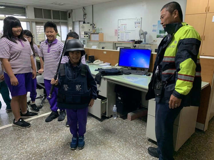 臺東縣太麻里鄉美和國民小學四年級學童於7日上午舉辦社會課校外參訪活動,美和派出所警員張國輝、鍾佩倫等2人負責接待,並帶領六位國家未來的主人翁認識警察工作項目及警用裝備,員警除了介紹警用腰帶、防彈背心、頭盔、盾牌、警棍、酒測器及雷達測速槍等基本應勤裝備,也讓小朋友一一穿戴體驗當個小小警察,讓學童了解警察平時工作的內容及辛勞。