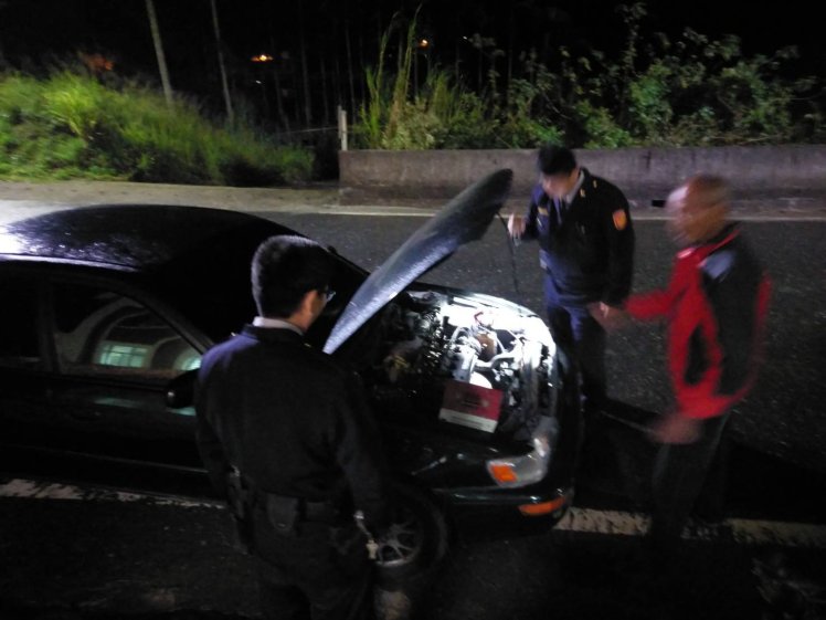 鍾所長表示,夫妻兩人外出拜訪友人,在準備回家時,汽車無故不能發動,當時為夜間,在不知如何是好之下,男子急得像熱鍋上的螞蟻慌慌張張地跑進派出所求援。「怎麼辦我的車子不會動了,這麼晚了,修車廠都關了,我與老婆不知如何回家。」男子慌張的說著。鍾所長見男子情緒緊張,便先安撫情緒,後即到現場查看,經一番細心檢查後判斷是電瓶沒電導致無法將引擎啟動。當下適值夜間,一時半刻也連絡不到汽車維修廠商和拖吊廠商,此時,幸好鍾所長靈機一動,想到自己的車上正好有跨接線與電源供應器可以使用,遂與男子合力先將車輛推到派出所門口,以電源供應器跨接車子電瓶再連接派出所電源插座,當男子坐上車重新發動,果然轟轟兩聲將車子順利發動,男子也鬆了一口氣,滿臉苦惱瞬間眉開眼笑的一再感謝所長的協助。鍾所長也再次溫心叮嚀男子,回去後務必儘速去保養廠檢查車輛狀況,以免相同情形再度發生或是發生意外。