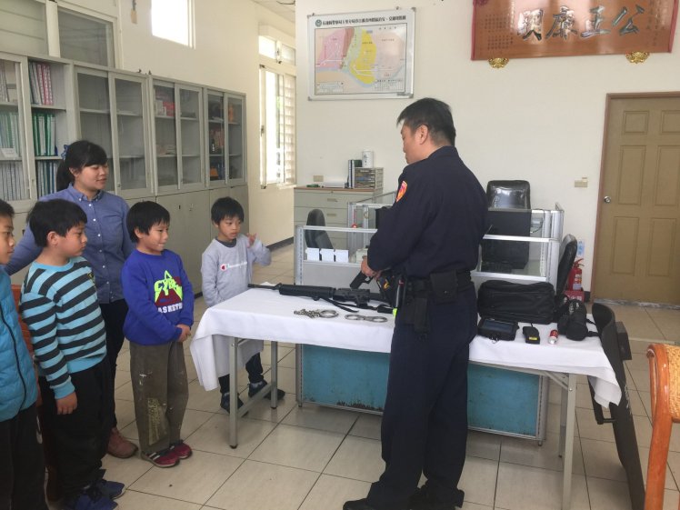 其中活動進行到警用裝備體驗時,特別讓學生們親自穿戴觸摸,體驗槍械、防彈衣等應勤裝備,現場笑聲、驚呼聲不斷,熱鬧不已,每位學生相當興奮的搶著要先體驗把玩。學生們在參觀並聆聽完簡介後,對於派出所的運作方式都有了初步的認識,透過互動加強學習的目的,建立正確交通、法治及自我保護的觀念,使交通、法治教育向下紮根。吳老師表示,春日派出所是我們部落的好鄰居,此次能讓學生們認識及體驗警察叔叔工作辛勞,並保護大家生命、身體、財產安全,是相當重要及有意義的。