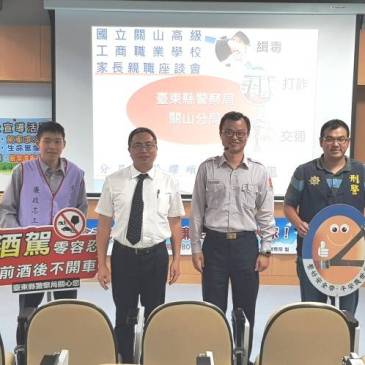 記者 盧金雄/關山報導 關山警察分局分局長蔡耀順受國立關山高級工商職業學校校長陳威男之邀,於昨(21)日下午3 … More 關警分局長參加關山工商家長親職座談令並全方位宣導反毒 反詐 交安 政風