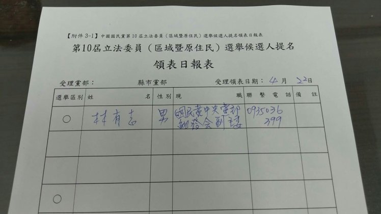 積極爭取立法委員國民黨黨內初選的林有志,今(22)日上午10點多前往國民黨花蓮縣黨部領表,雖然完成領表,也繳交了10萬元費用,但黨部表示領表無效。