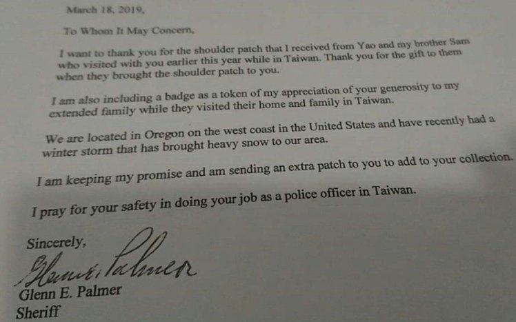 臺東縣警察局池上分駐所所長廖建全於日前收到一個來自萬里之遙「美國華盛頓州格蘭特郡」的包裹,打開後裡頭裝了一個警徽及左右臂章,還有一封全英文打字的信件,經翻譯得知,寄件人的哥哥Sam Palmer(薩姆帕爾默),於今(108)年農曆年至池上分駐所與員警交換臂章,受到池上分駐所所長廖建全熱情接待,並贈送池上冠軍米禮盒,帶返家鄉後,將臂章交由任職於格特蘭郡治安官的弟弟,開心的回寄這份「萬里包裹」,向廖建全所長表達最誠摯的謝意!