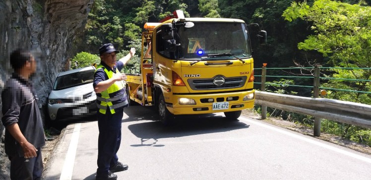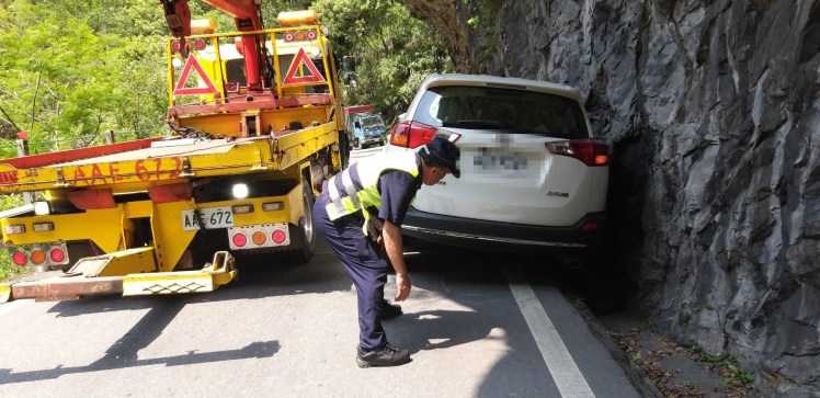 新北市林姓女遊客偕同友人共5人今(7)日駕車欲至花蓮縣天祥祥德寺參拜,因對道路狀況不熟悉,會車時導致擦撞山壁而車輛陷入山溝,求助天祥派出所才得以脫困。