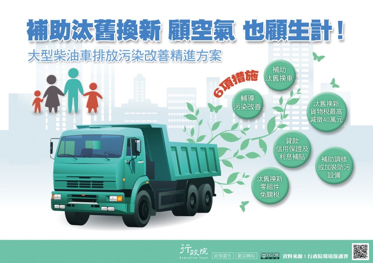 老舊柴油車所排放的廢氣,除了影響空氣品質及造成民眾不良觀感外,對人體健康也可能產生莫大的危害,為減輕車主購車負擔需求,環保署已於108年3月8日公告「大型柴油車汰舊換新補助辦法」修正草案,預計將於6月1日起施行,補助至民國111年12月10日止,第1至3期車汰舊換新補助最高補助新臺幣65萬元,請有意願之車主多多把握。