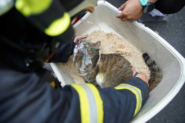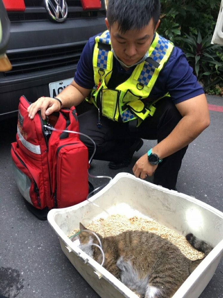 而搶救過程之中,消防人員在火場之中同時發現屋主飼養的寵物貓,貓隻因受困火場吸入濃煙而奄奄一息,消防局人員立即將其救出,交由救護人員給予氧氣施救,待貓隻恢復意識後交由飼主帶至寵物醫院就醫,挽救一條寶貴生命。