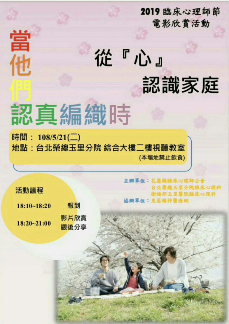 社團法人花蓮縣臨床心理師公會、臺北榮民總醫院玉里分院臨床心理科、衛生福利部玉里醫院及東區精神醫療網,也預計在2019年5月21日18:10-21:00,於臺北榮民總醫院玉里分院綜合大樓2樓視廳教室舉辦一場影片欣賞活動,共同歡慶臨床心理師節,此活動預計邀請玉里鎮社區民眾一同觀賞「當他們認真編織時」的影片,此影片主要在講述是性別平等的議題,它引領著大家思索是否一定要是男女結合的家庭才是幸福的嗎?是否男男、女女、或與跨性別者組合的家庭就沒有幸福嗎?就會對小孩的生長不利嗎?為何性別平等議題,是一件值得被重視的議題呢?不論是異性戀者、同性戀者、雙性戀者或跨性別者,每個人都渴望被「認同」,而一個人性傾向的形成除了受社會文化影響外,仍受基因、荷爾蒙、其他生理因素影響,雖然目前對於性傾向形成的機制尚未十分清楚,不過性傾向多數不是個體能選擇的,也難以主觀改變。