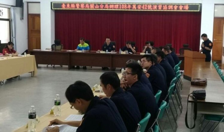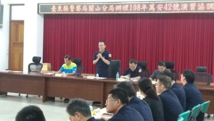 臺東縣警察局關山分局為使108年全民防衛動員(萬安42號)演習能順利完成,於昨(14)日15時特邀集各機關、學校、公司、加油站、義警、民防等,參加由分局長潘仕能所主持的「108年度萬安42號防空演習協調會」,務求演習萬全。
