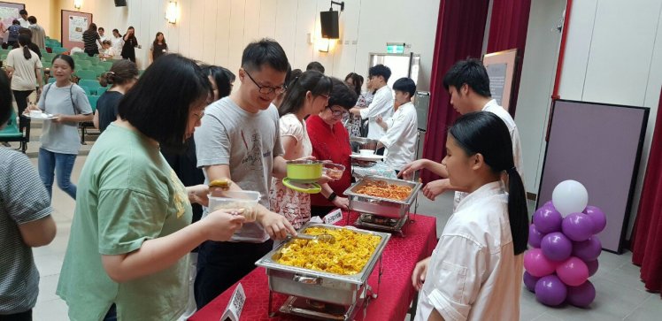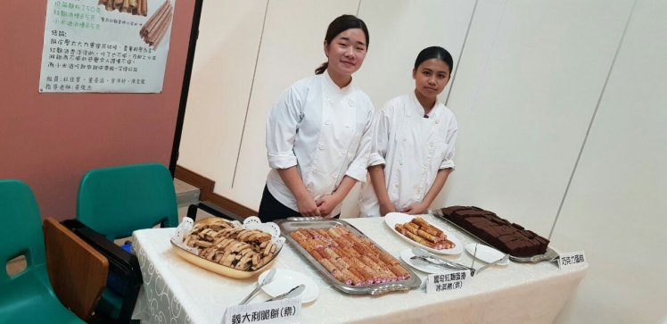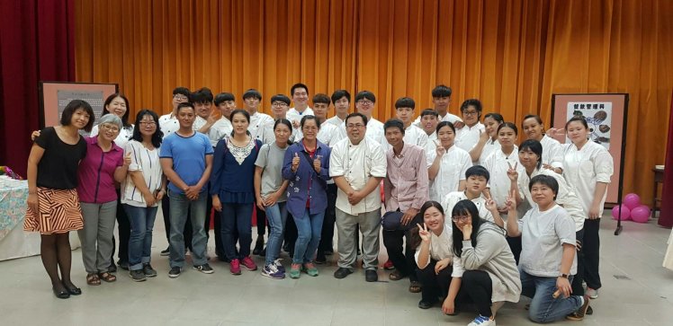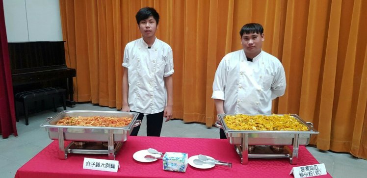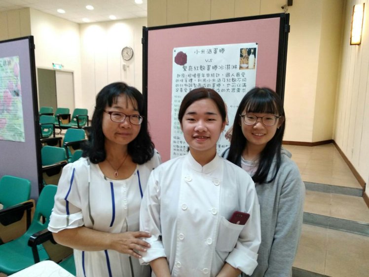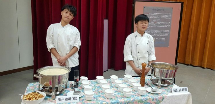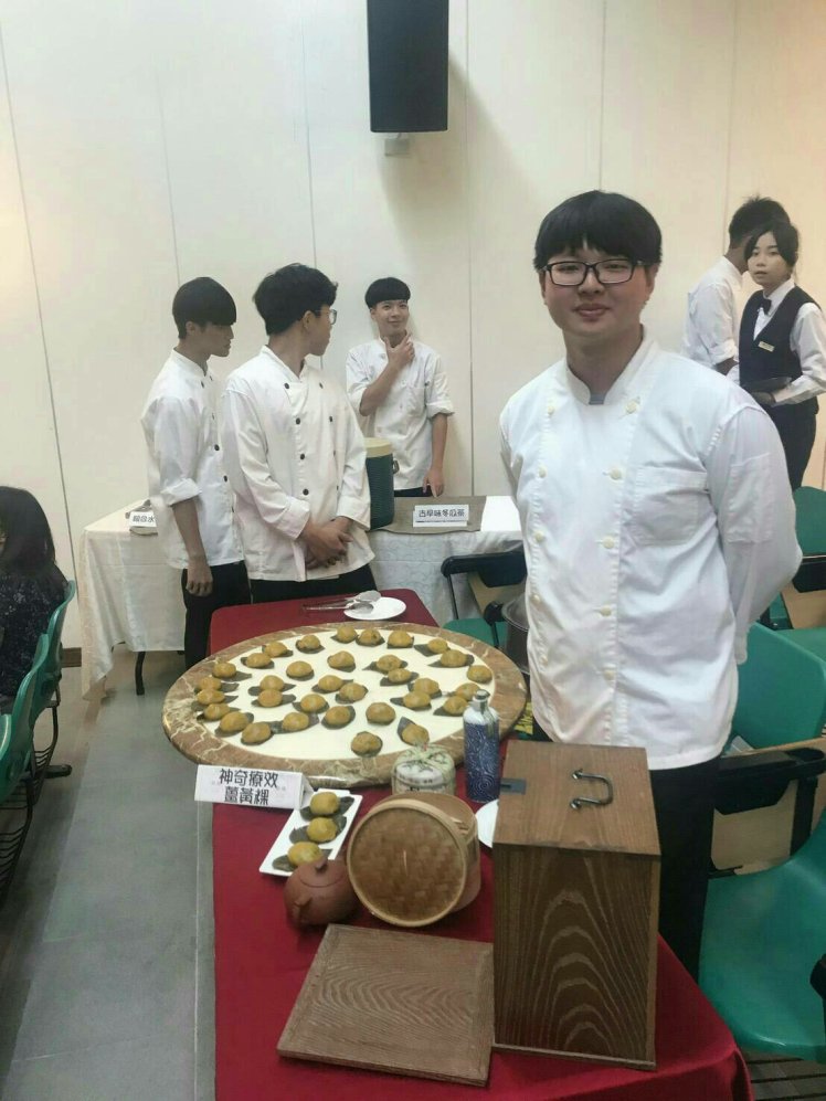 董晏滋、杜佳寶、曾沛婷、陳聖龍四位同學專題製作蛋捲,利用紅麴酒糟和小米紅糟製作麵糊的變化,每個蛋捲的內餡是採用冰淇淋紅麴,甜而不膩令人讚嘆不已,除了上述的食材外,尚有馬鈴薯沙拉、海蜇皮涼拌、南瓜米粉、丼飯、檸檬冬瓜茶、水果盤,供與會來賓、畢業生家長及全校教職員享用。