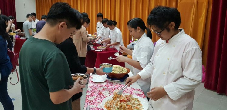 (20)日餐會現場,玉高餐飲科畢生準備最好的食材,製作出色香味俱全的佳餚,讓現場來賓滿口稱讚,與會家長個個笑不攏嘴。其中最具特色的薑黃粿是由草仔粿改良而來,學生李朋承、林伯諺、姜承宏自帶的薑黃結合黑胡椒粒,具有消炎的作用,讓粿增添了黃色的視覺效果。又配合五月溫馨的母親節,學生田怡心、張淳媛、方慧美、林惠萱因家中務農,試菜時,特別將有硫跟無硫的金針實作,發現有硫吃起來比較清脆,無硫的取向健康,所以他們決定製作無硫金針排骨湯,金針花又稱為萱草,在花東縱谷花季時,除了是農家的經濟來源,廚師的佳餚食材,更是花蓮南區重要的觀光產業。