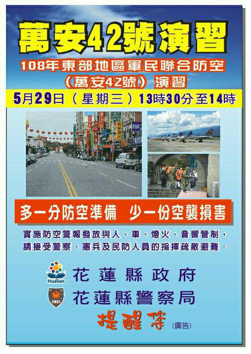 108年度軍民聯合防空「萬安42號」演習,訂於5月29日(星期三)下午13時30分至14時止實施「有預警」方式演習。花蓮縣警察局玉里分局近日至各機關、公司、行號、社區鄰里張貼宣導海報、並利用巡邏車車體懸掛宣導布條及以錄音帶配合擴音器在轄區巷道來回梭巡播放。