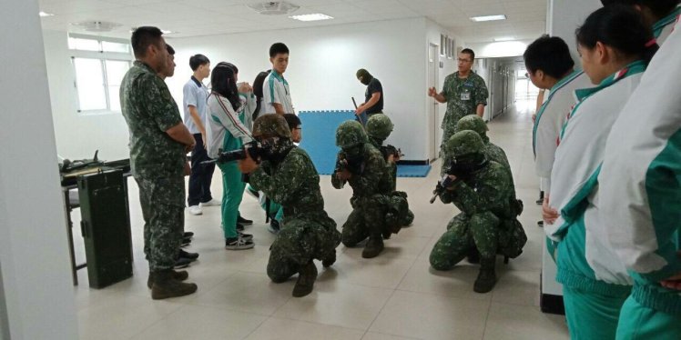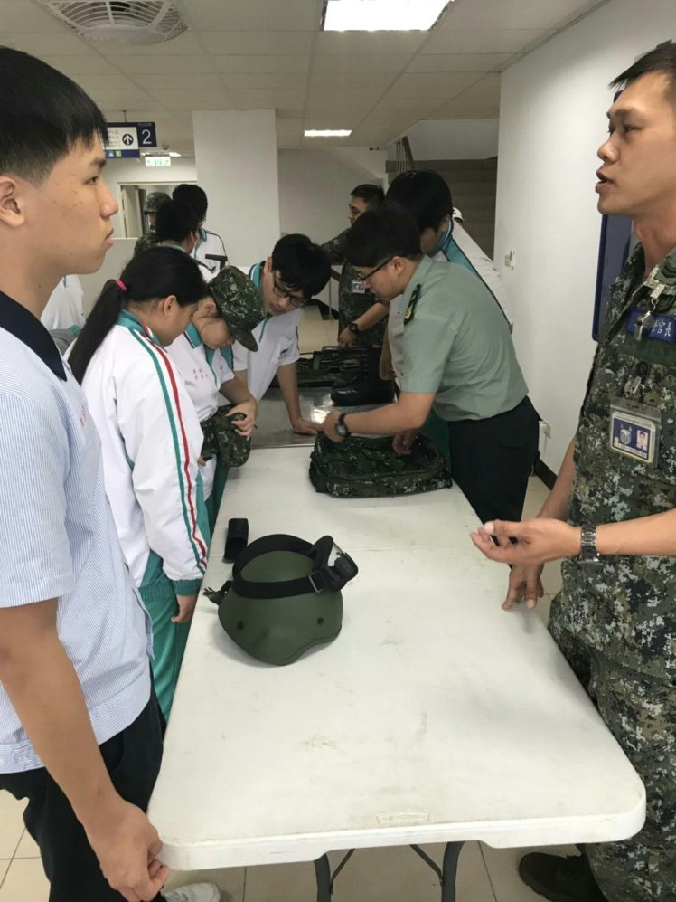 用完餐後,經過短暫休息,為了能讓同學更體認國軍戰備的辛苦,安排師生一行人實際體驗室內近戰操演。參與演練的同學均近距離接觸T91步槍及M249機槍等裝備和學習室內近戰戰鬥技巧。此外現場亦陳列各式戰鬥工兵裝備,包括地雷搜索器、生命探測器、戰鬥個裝、防爆服等裝備供同學實際操作、試穿。