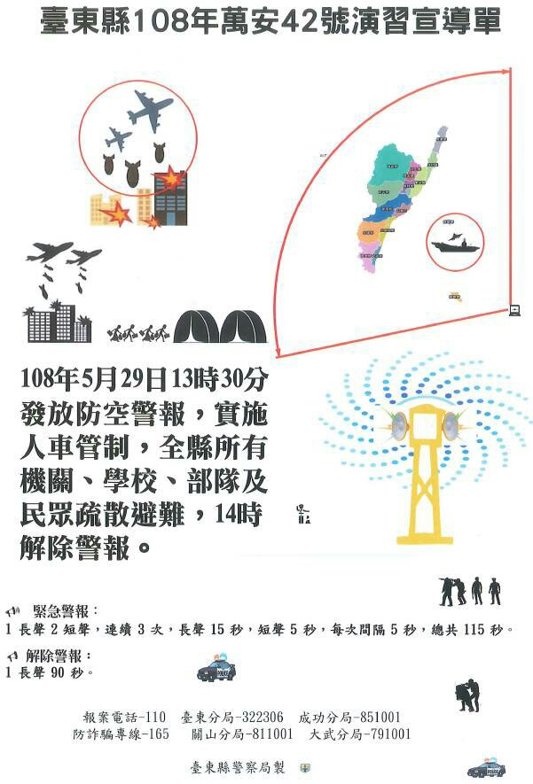 臺東地區軍民聯合防空(萬安42號)演習,訂於5月29日下午1時30分到下午2時進行,演習期間,民眾需配合執勤人員指示進行疏散。