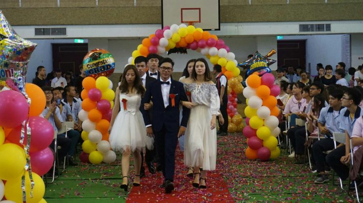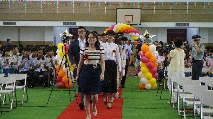 典禮開場即由畢業生以創意造型、熱舞等不同方式進場,帶給在場來賓耳目一新的震撼,觀光三陳錦雲導師即將於今年六月底退休,扮演延禧略現代版「玉中攻略」,由班上號稱F4的同學護駕盛裝的錦雲娘娘與11位格格,從「玉中宮」出發,進行校園巡禮後端莊入場;最後進場的進修部雖只有8位畢業生,但活力十足,表演的蔡慶雄同學領有街頭藝人證照,也是樂器行的爵士鼓老師,現場一段感謝包含所有畢業班導師名字的RAP(饒舌),博得滿堂采。