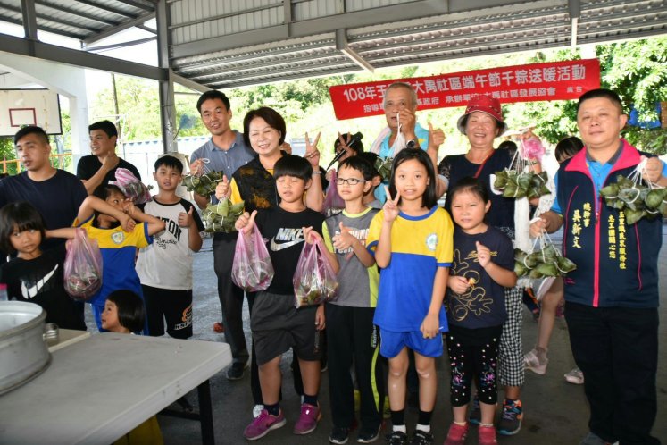 現場來賓有潘月霞副議長與大禹國小巫賢偉校長帶領一行30位師生,共同參與今天的活動,學生們在老師與社區家政媽媽的指導中,一顆顆粽子陸續包綁完成。完成後的粽子,則由張添富理事長帶領社區幹部,親自一一送達弱勢家庭與獨居長者等家中。