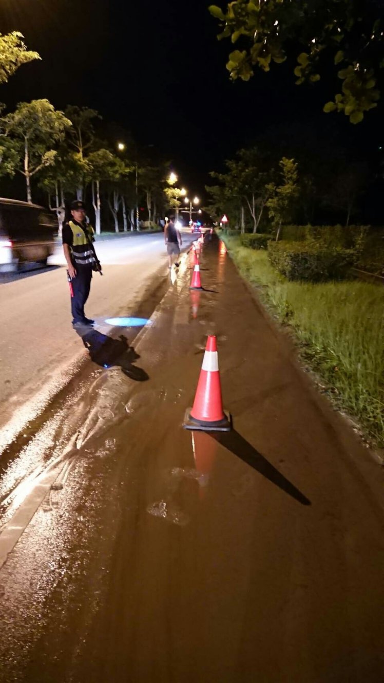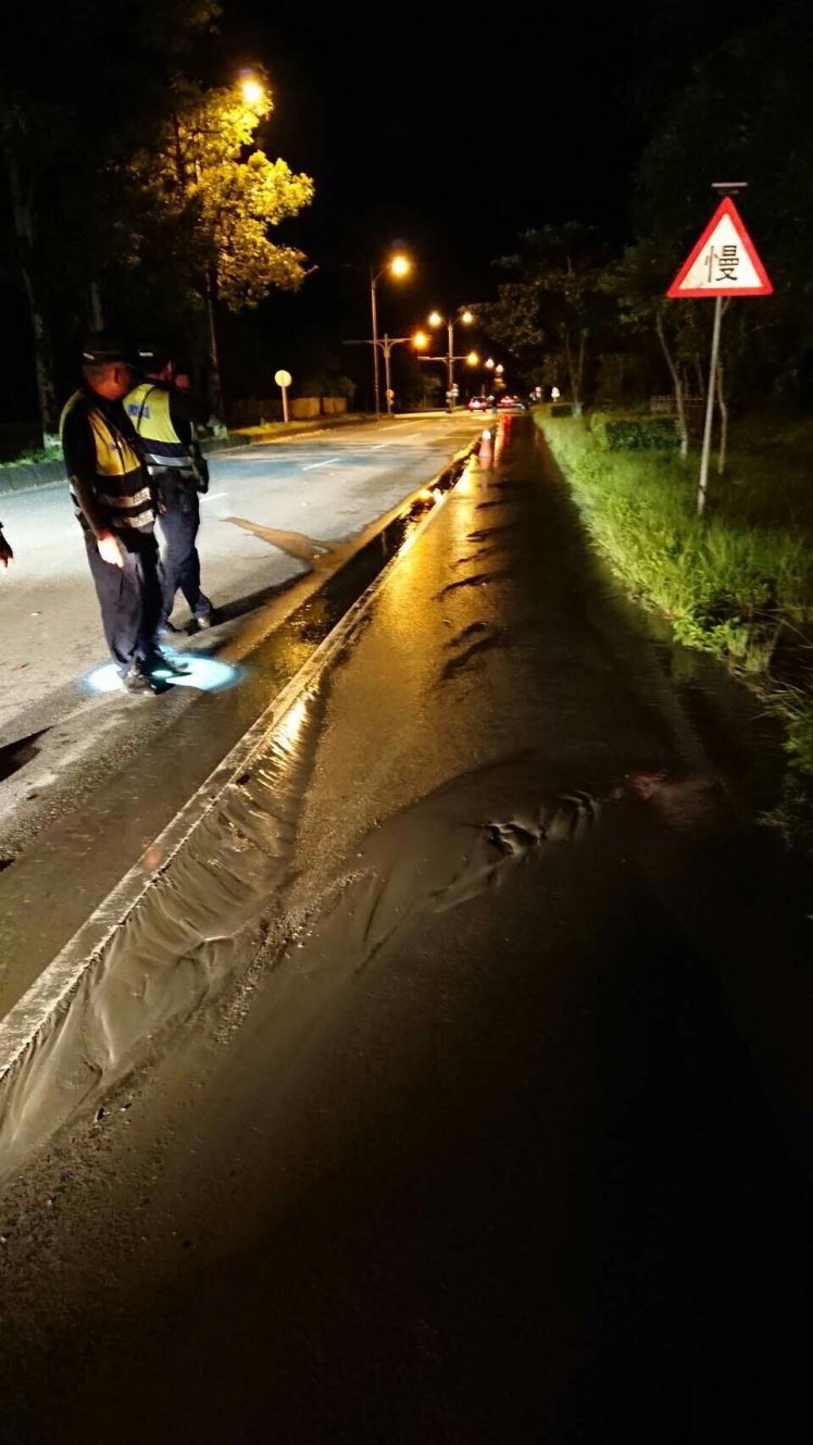 花蓮縣警察局鳳林警分局長橋派出所副所長許祐禎、警員謝有勝日前晚間執行巡邏勤務時,在20時10分許行經台九線246公里南下車道處發現慢車道與快車道皆有流動積水滾滾而來,員警沿著水勢勘查,見馬太鞍溪溝濬及灌溉水溝口湧出大量的泥水往台九線奔流而下,河水漸漸淹沒慢車道至快車道路面,副所長許祐禎唯恐影響用路人安全,立即報告分局勤務指揮中心,啟動防災機制,以巡邏車開啟警示提醒路過民眾前方有積水,並擺放交通錐令車道縮減,讓駕駛人避開淹水道路行駛。