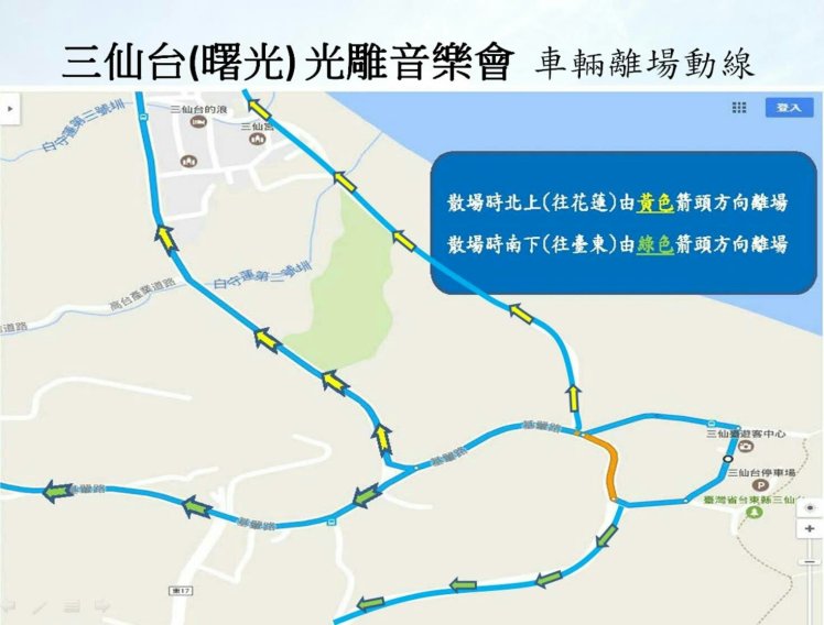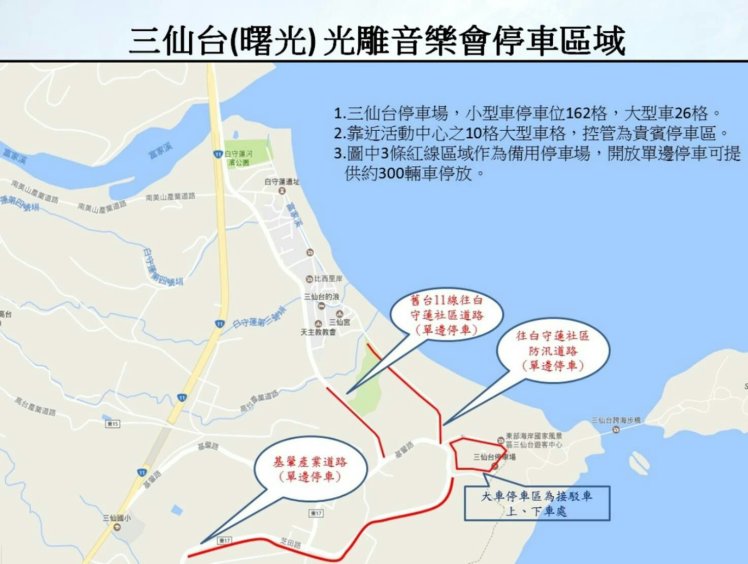 成功分局表示,今年光雕音樂會三仙臺場將在7月6日清晨舉行,為確保活動現場交通秩序,警方將於凌晨3點開始管制疏導車輛進入會場,三仙隧道北端與舊臺11線會合點將禁止車輛進入;另舊臺11線往白守蓮社區道路、防汛道路及基翬產業道路將實施單邊停車,請民眾確實遵守規定,以共同維護會場周邊交通秩序。