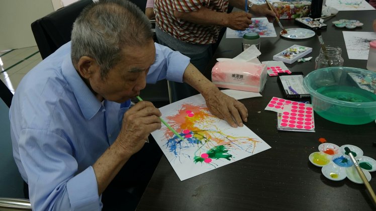 運用水彩、貼紙與吸管,不同材料的結合,創造出畫紙上各式的精靈。長者選擇自己喜愛的顏色,滴在圖畫紙上在運用吹氣把顏料帶到畫紙的各處,活潑又獨特的圖案就誕生了。完成一幅畫後每位長輩的肺活量都提升了呢。
