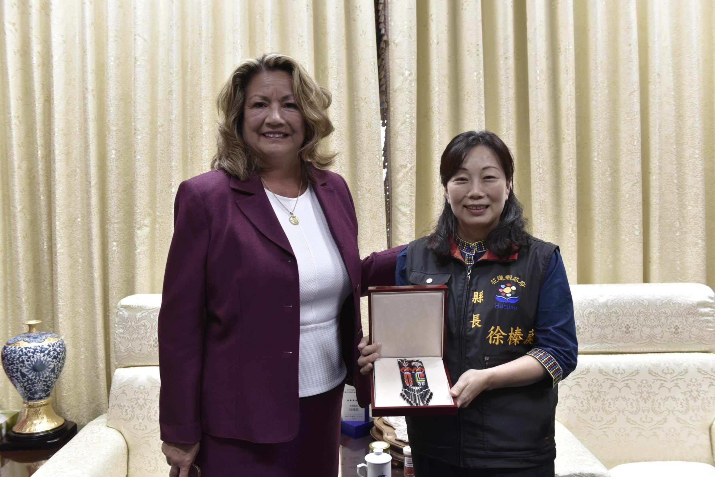 徐榛蔚縣長提到花蓮縣擁有得天獨厚的自然資源,純淨的空氣與乾淨的水源灌溉著豐沃的土壤;花蓮縣是全臺面積最大的縣市,同時亦是有機農業大縣,有機農產面積占全國之最,花蓮代表著健康,她盛情邀約費雪市長明年7月前來花蓮共同參與原住民豐年節,體驗原住民文化,強化台、美兩地觀光交流。