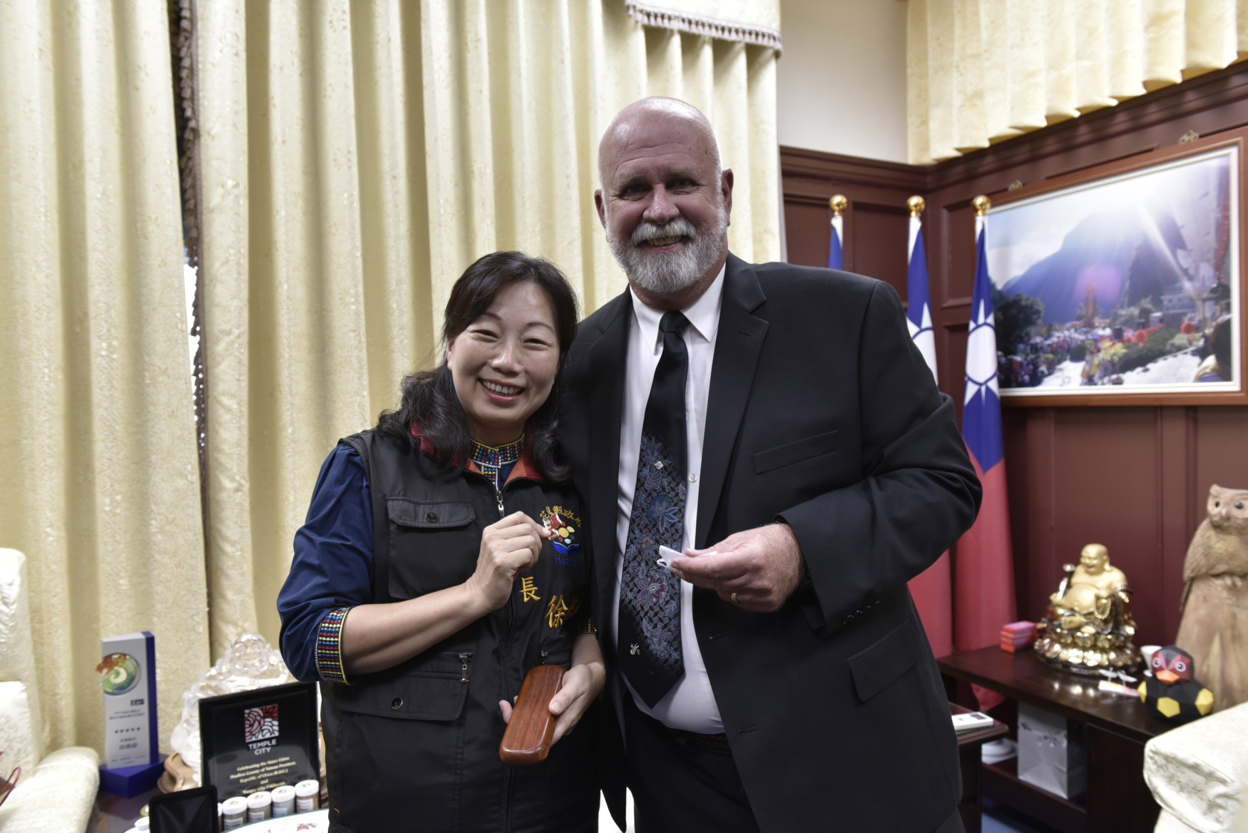 拜會結束後,天普市市長南妮特.費雪致贈天普市之鑰予花蓮縣政府,象徵花蓮縣與天普市之友好關係,縣長徐榛蔚隨後也致贈典石、原藝百工等代表在地之書籍與原住民手工珠鍊,包含對在地文化的尊敬與祝福;天普市澳洲姊妹市協會創辦人史蒂夫.泰瑞也致贈原木鋼筆組與紀念胸章。