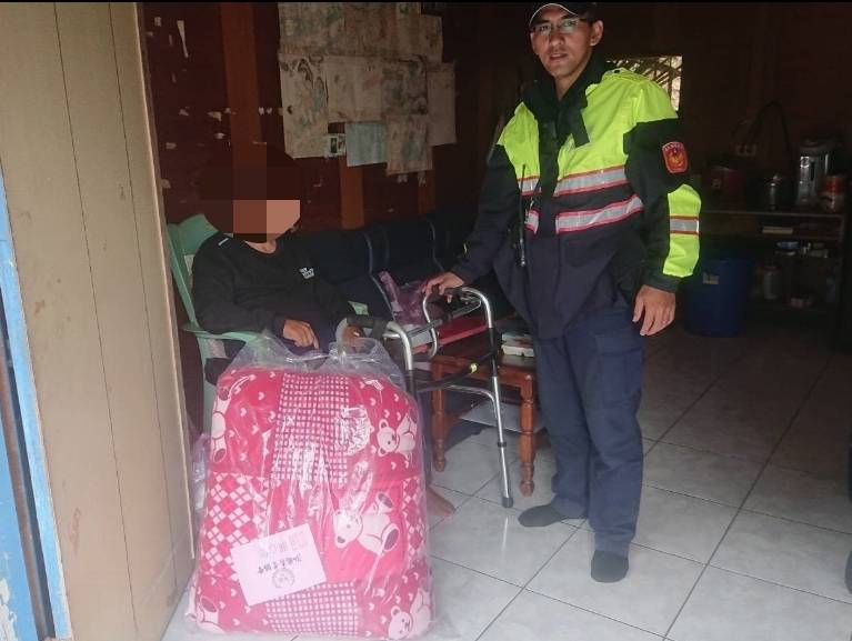 近日冷氣團發威,氣溫像溜滑梯般直直落,北部地區出現僅十幾度的低溫,讓人冷到「吱吱叫」;日前花蓮縣玉里鎮的媽祖宮管理委會及泓德志業協會人員有感於此,主動連繫位於南橫公路(臺20線)的關山警察分局海端分駐所,表示欲捐贈獨居老人及弱勢家庭20床棉被, 海端副所長黃自成隨即向海端鄉公所社福業務承辦人洽詢調查轄區弱勢名單,期將愛心送到真正需要的人手裡;昨(4)日14時許,由黃副所長率同所內警員王馬可及邱忠華等人,協同善心團隊人員,一一將棉被親送到他們家中,此時山區雖然寒氣逼人,但每位長者心中都深深感受到來自於社會的暖暖溫情,長者也以充滿感恩的眼神向大家深深道謝,讓他們「蓋在身、暖在心」,暖暖的度過這個寒冬!