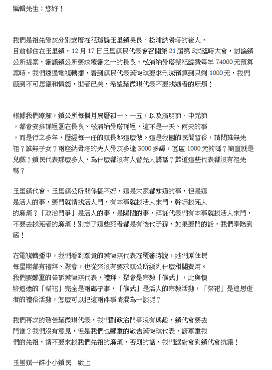 玉里鎮民代表會針對某媒體發布的讀者希望「玉里鎮民代表不要找逝者的麻煩!並表示鎮公所每個月農曆初一、十五,以及清明節、中元節,都會安排誦經團在長良、松浦納骨塔誦經,請尊重我們的先祖,請不要來找我們先祖的麻煩」等語,發表嚴正聲明 :
