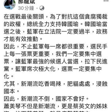 新聞中心/綜合報導 郝龍斌在臉書公開表示,在選戰最後關頭,為了對抗這個貪腐獨裁的政權,總統全力支持韓國瑜。韓國 … More 郝龍斌表態支持傅崐萁 呼籲拉下蕭美琴就是痛擊蔡英文