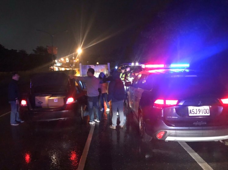 車隊行經台11丙東華大橋時,突然傾盆大雨,由於裝載選票箱的小貨車車頂無加蓋,為防止選票淋濕,勤務同仁冒雨協助選務人員將選票箱移置到箱型車內,因當時路上往來車輛速度很快,加上大雨視線不佳,員警立刻冒著大雨協助搬運選票箱及指揮交通,以維護人、車及選票安全,防止其他車輛從後方追撞,並安全的將選票送回花蓮選務中心。