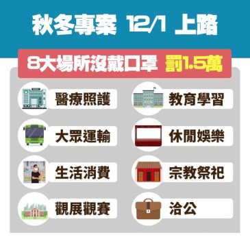 記者 回添史/編輯整理 中央疫情指揮中心公布,自12月1日起啟動秋冬防疫專案,分為社區防疫、邊境檢疫、醫療應 … More 秋冬呼吸道傳染病盛行 12月啟動防疫專案 八大類場所不戴口罩最高罰15000元