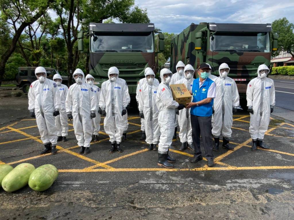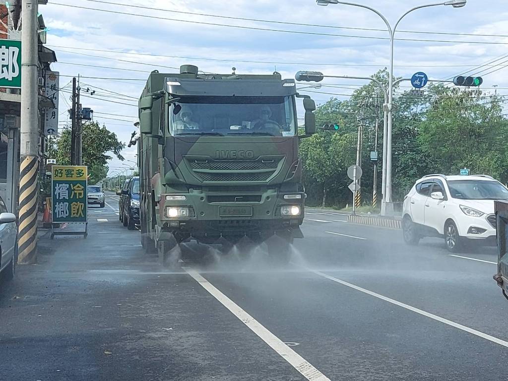 劉耀宗感謝國軍化學兵連弟兄們頂著烈日以清消行動守護鄉親健康,壽豐鄉執行預防性消毒地點,係針對人潮聚集場所、商圈、超市、市場、商圈、住宅區等加強公共環境進行預防性消毒。