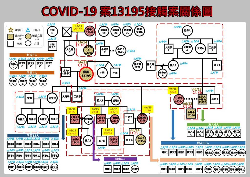 案13415是案13304(其母案13368)之大伯,為30多歲男性,因與確診姪女同住匡列採檢,於6月15日確診,該案為亞洲水泥員工,平日足跡單純皆往返工作地與自宅。案13414為案13415之子,10多歲男學生,平日往返祖父母家視訊上課,足跡單純,與其父同日確診。