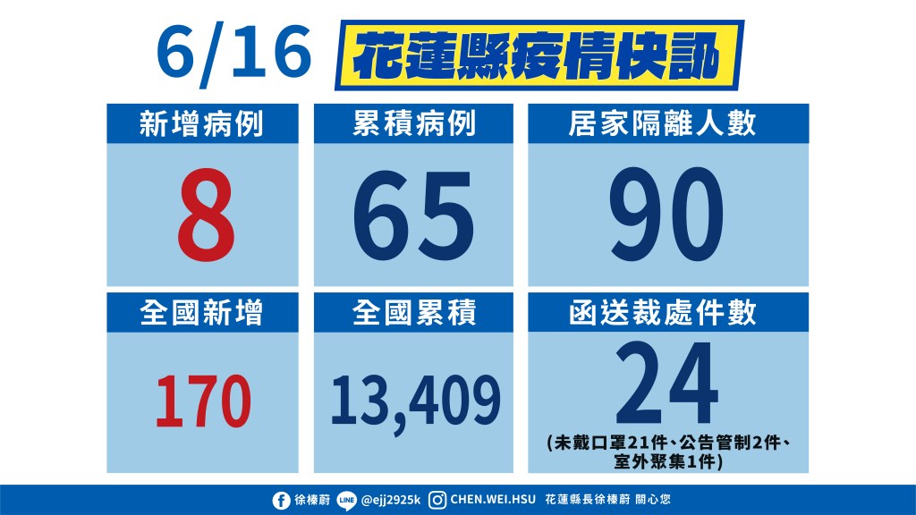 衛生局長朱家祥表示,花蓮縣衛生局進行篩檢的結果,截至目前篩檢共計7,555人,其中PCR陽性反應共計有7人,整體陽性篩檢率為千分之0.9。針對今日花蓮縣新增確診8案例足跡說明,案例皆起源於前(14日)確診之案13195。案13369是案13195之婆婆,為60多歲女性,本身患有失智、糖尿病、中風等疾病且不良於行,平日由其小女兒(案13303)照顧。因行動不便故平日皆在家中,足跡單純,因案13303確診匡列採檢,於6月15日確診。