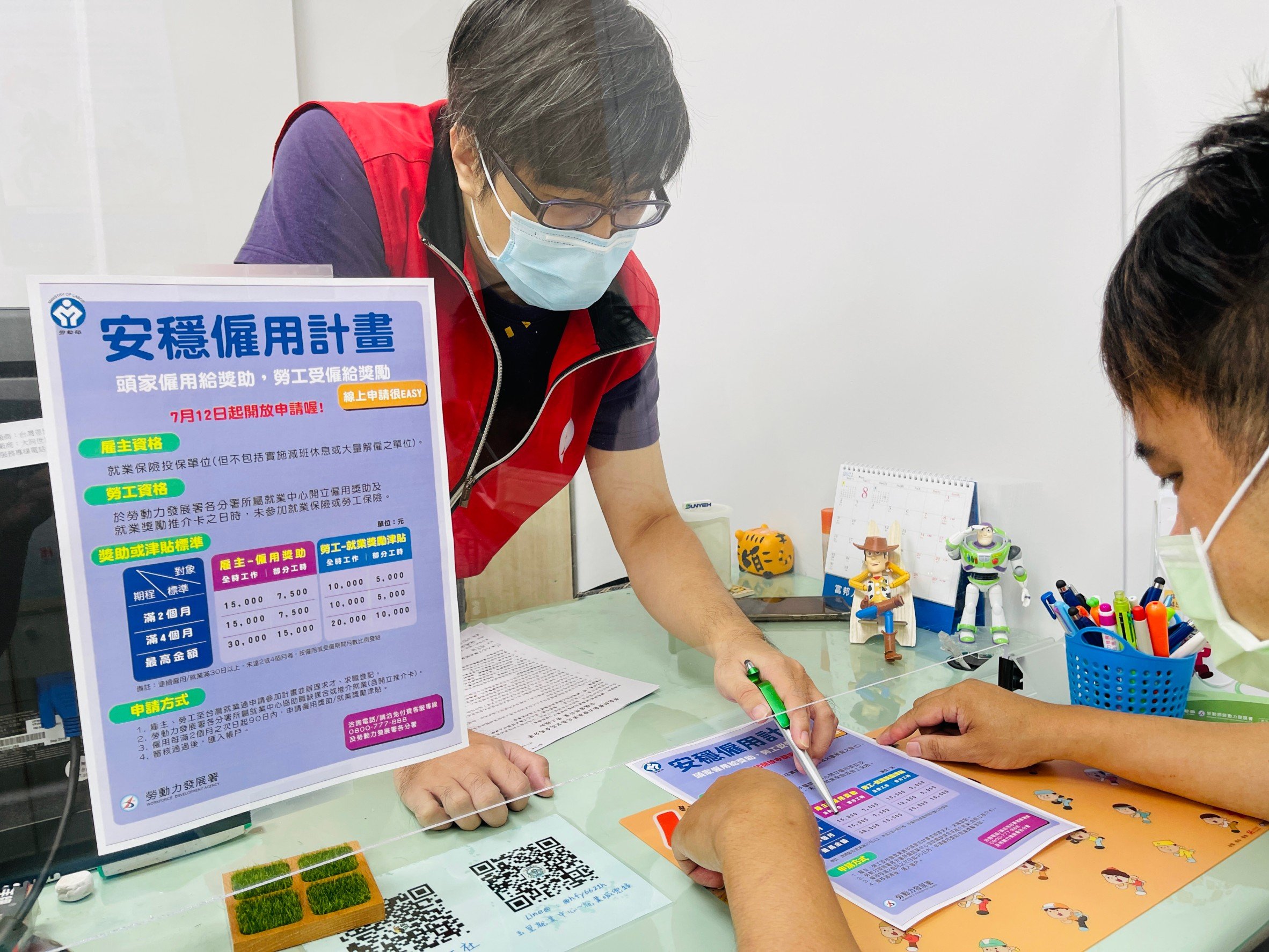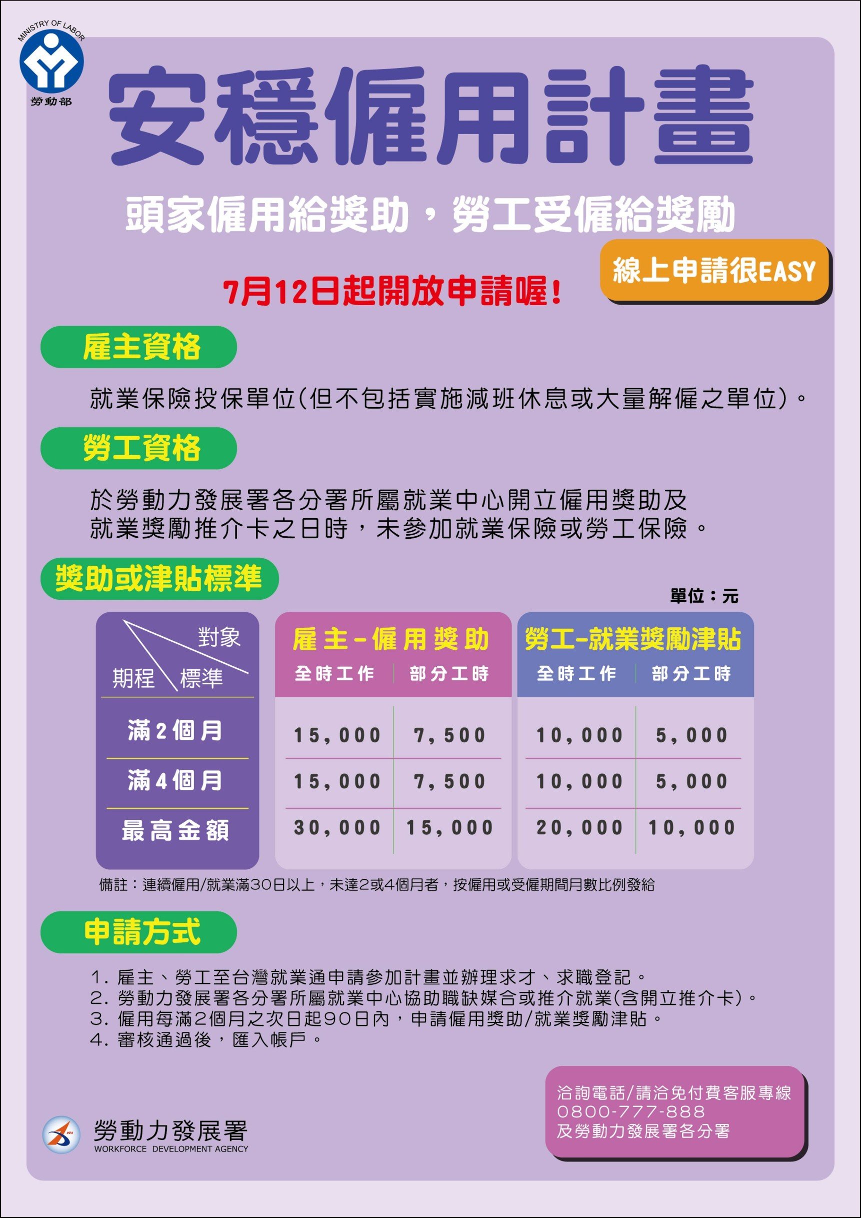 新冠肺炎疫情嚴重衝擊就業市場,勞動部玉里就業中心鼓勵在地事業單位至台灣就業通網站線上申請參加勞動部「安穩僱用計畫」,雇主資格只要無實施減班休息或大量解僱勞工情事,且有投保就業保險的民營企業、團體或私立學校皆可參加,勞工待業中及未有參加就業保險或勞工保險紀錄者皆可線上申請登記。9月30日(含)前僱用就業中心推介的勞工,符合相關規定,即發給僱用獎助最長4個月,最高可領3萬,受僱的勞工同時也獲得就業獎勵津貼,最高發給2萬。