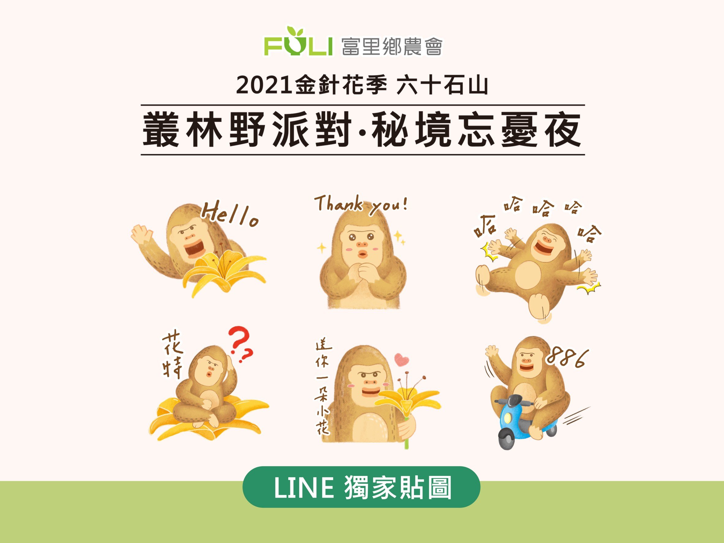 由於今年金針花季受到疫情影響,活動整體活動將以線上推廣為主,但富里鄉農會發揮創意以 「叢林野派對.秘境忘憂夜」為主題,讓近年最受歡迎的吉祥物「福猩」帶著大家一起party party!
