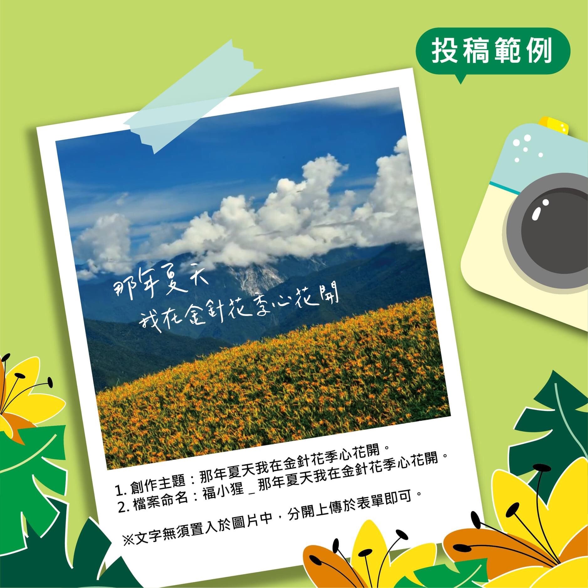 於徵稿期間挑選出自己曾在六十石山針花季拍攝的照片,並以「那年夏天我在金針花季_」造句,上傳至指定網址,FB按讚票數最高的前50名之作者即可獲得富里金針花限量禮盒,作品也將展示於富里鄉農會以及宣傳影片。參加投票者亦可獲得精美禮品抽獎機會。