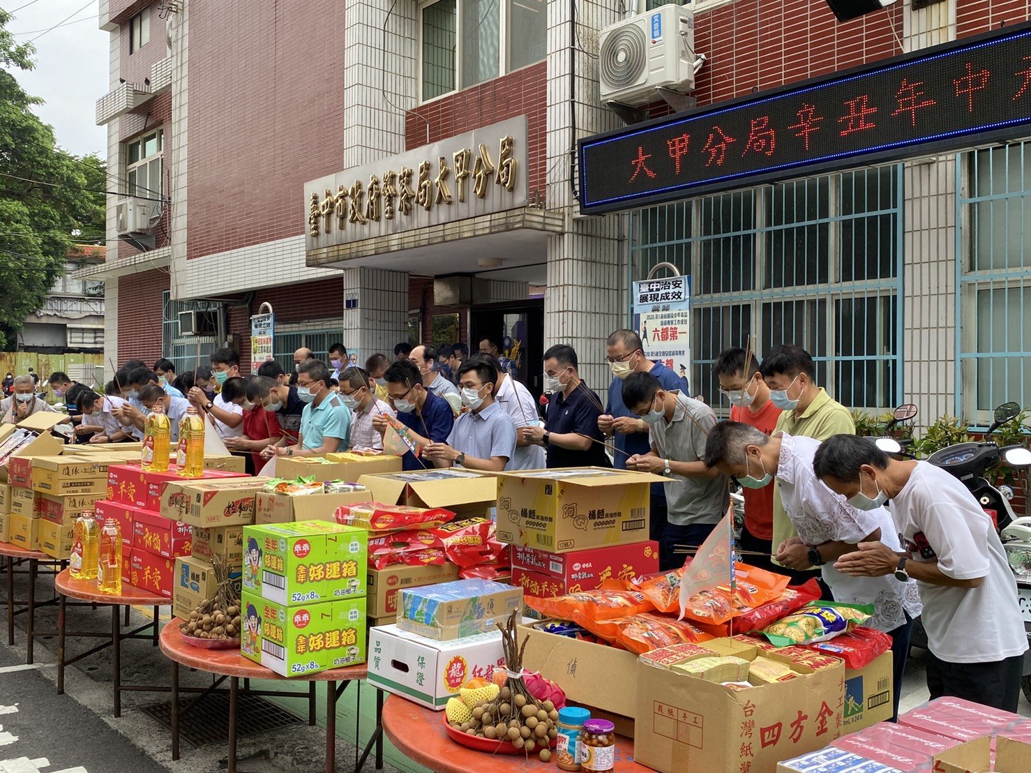 今年受到新冠肺炎疫情衝擊,又遇天象異常,夏日炎熱缺水,夏秋之際卻又大雨不斷,造成許多家庭生計受到影響,為了讓中元普渡活動更具意義,大甲警分局特別結合分局本部各分駐(派出)所供品,統一在分局前舉行祈福儀式,並捐出分局普渡供品一起做愛心。供品種類眾多,除了可提供給弱勢家庭作為生活物資食用外,最主要是替貧苦弱勢民眾的心靈點燃一盞溫暖的心燈,讓他們感受到社會處處有關愛。
