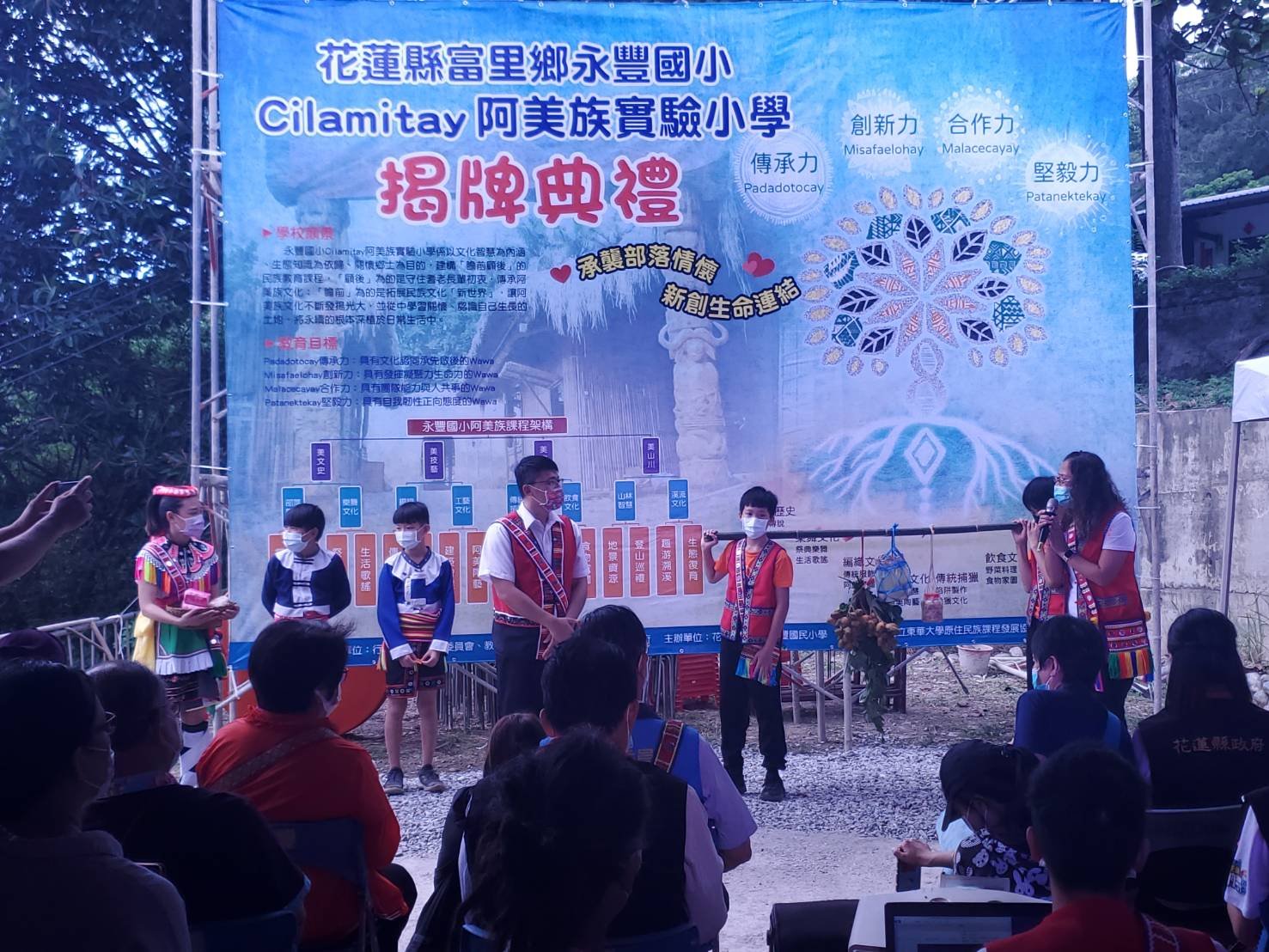 花蓮縣富里鄉永豐國小今26日舉行吉拉米代阿美族實驗小學揭牌暨新校園運動啟用典禮,原民會林碧霞副主委、國教署林政弘科長、花蓮縣政府原行處陳建村處長、教育處翁書敏副處長、李宗憲督學、原住民族課程發展協作中心陳張培倫主任、孫永承代表及地方頭目等共同到場祝福。