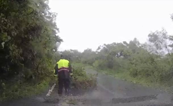 璨樹颱風花蓮縣災害應變中心於11日上午8時一級開設,晚間為花蓮帶來不少風雨,造成部分山區有斷枝落石情況,今12日上午7時許,吉安警分局鹽寮派出所長黃鏡峯巡視轄區時,在山嶺路往悅來飯店以南120公尺處,發現路樹不敵強風倒於路中,影響行車安全,經黃所長徒手以山鐮刀分段清除後,迅速恢復現場交通。