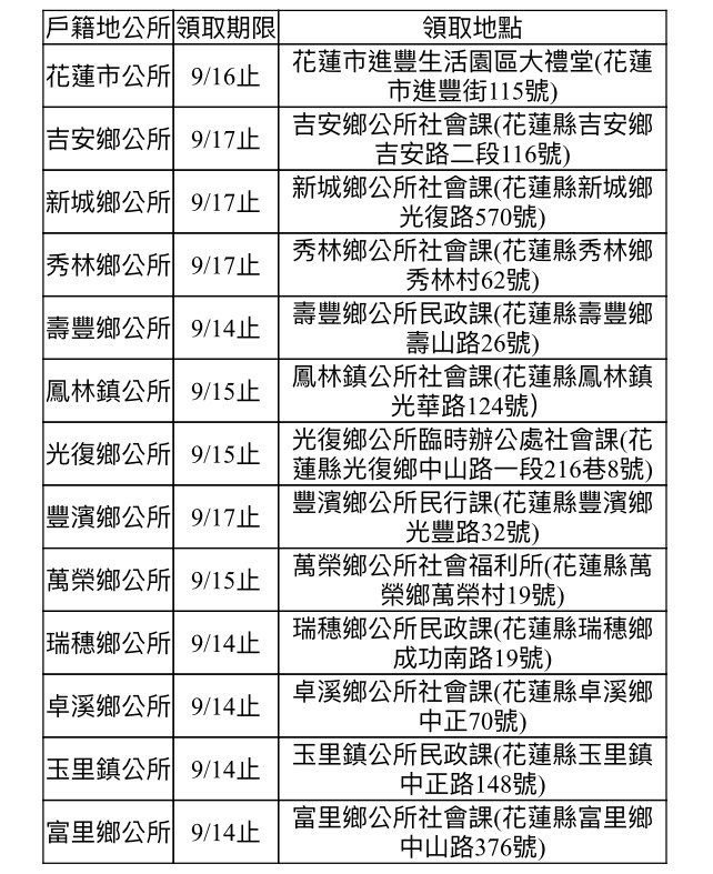縣長徐榛蔚再次感謝各鄉鎮公所協力合作,讓本縣鄉親在疫情警戒之後,璨樹颱風之前順利領取物資,感受來自政府的關懷,共度美好佳節;並提醒尚未領取物資但持有通知單的民眾,可在所列期限前(如下表),持通知單到各鄉鎮指定地點領取。